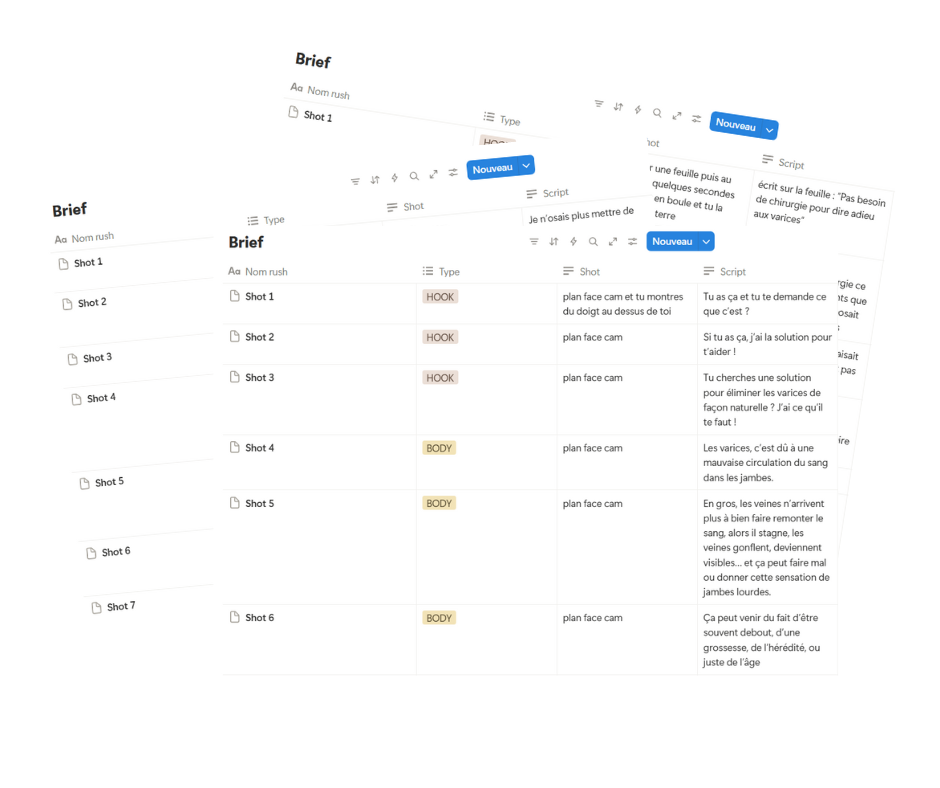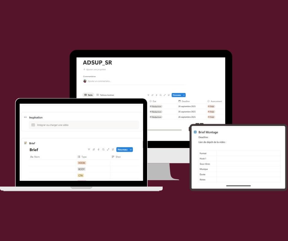 Avec le pack AdsUp, tu reçois un espace Notion contenant 3 scripts publicitaires prêts à filmer. Tu n’auras plus qu’à faire appel à un créateur de contenu ou filmer les publicités toi même en suivant les indications des scripts.